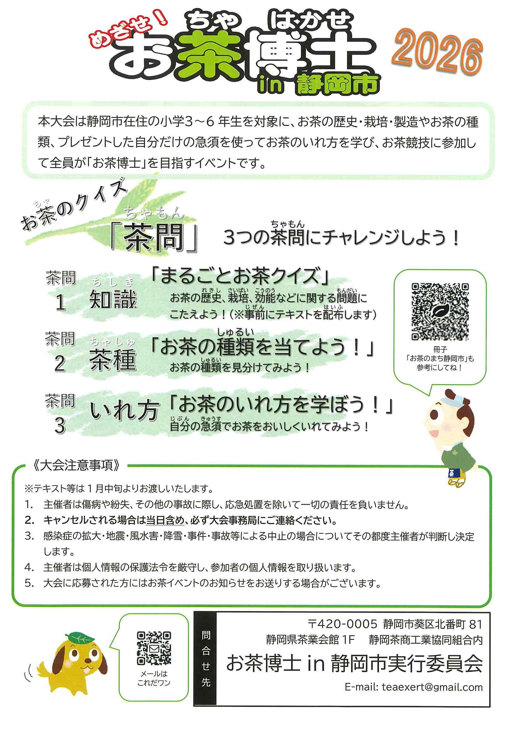 静岡市内在住の小学3年生~6年生を対象に【お茶の歴史・栽培・製造などの知識、お茶の種類、急須を使ったお茶の入れ方】を学び、お茶競技に参加して全員が「お茶博士」を目指すイベントです!